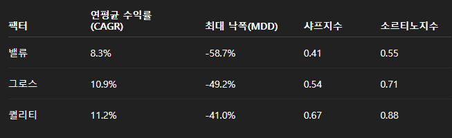 👉 단기 트레이딩에는 부적합하지만, 장기 멀티팩터 포트폴리오에서 퀄리티는 안정성을 높이는 핵심축.